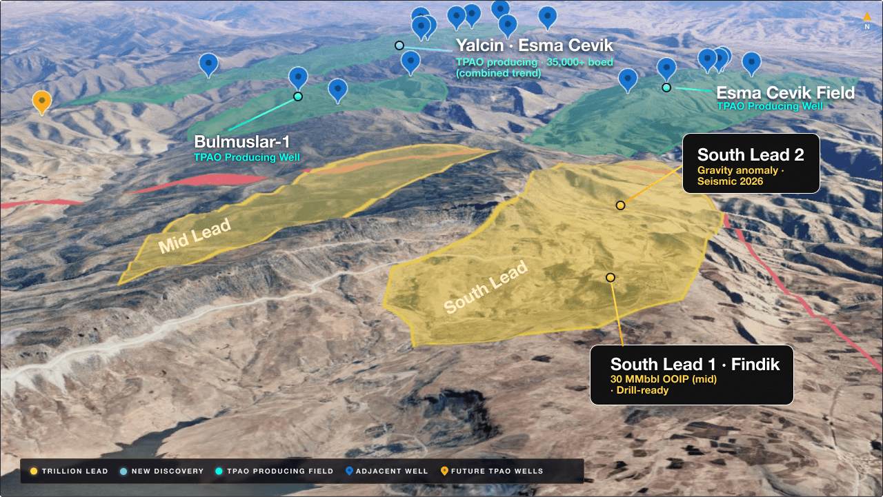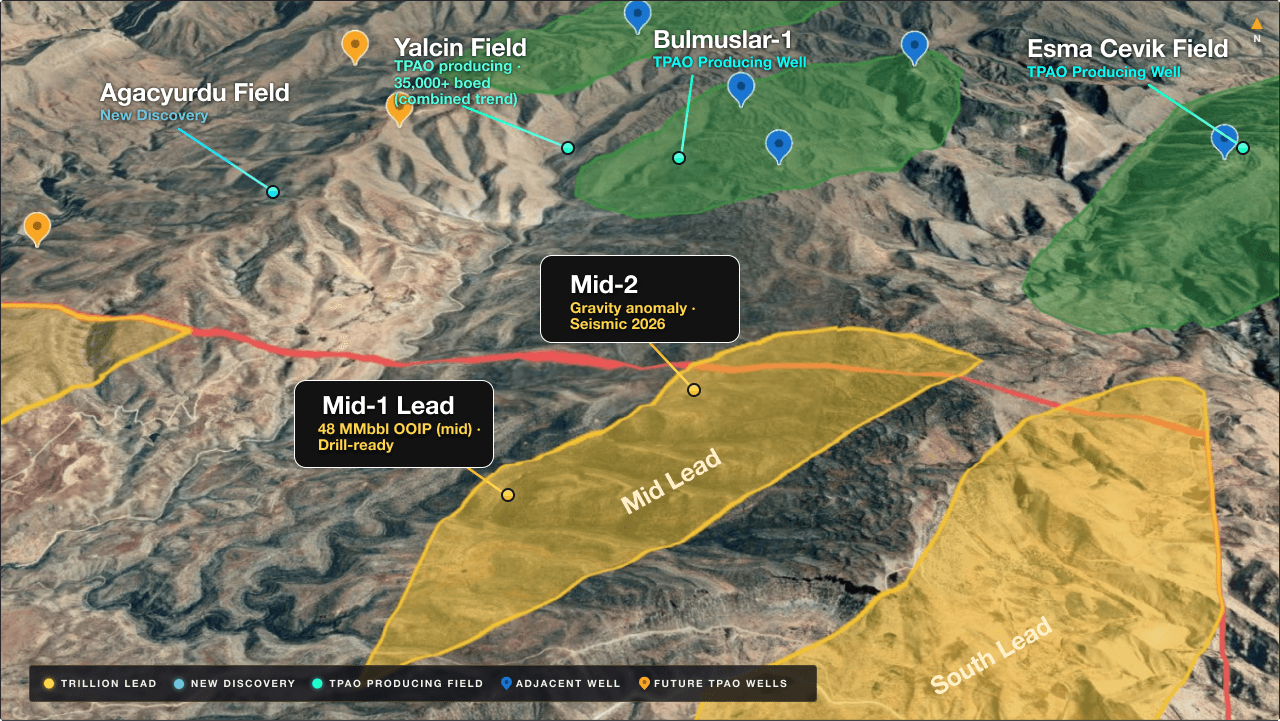 On the same south-dipping carbonate fairway, Bulmuslar, Şehit Aybüke Yalçın, Esma Çevik and Agaçyurdu collectively flow 35,000+ boed for TPAO.1 Trillion's M47 discovery sits on this trend. Three more leads follow.